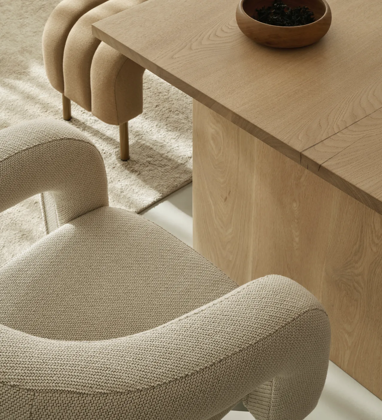 The name of the product family, Boa, refers to the expressive and winding shape of the back of the chair. The modern Boa is subtly transformed by different material choices. It manages to be able to blend in, as well as a visually powerful design element. In our design projects, we noticed a recurring need for seating furniture that furnishes spaces with large square footage, and that can withstand the eye and time. The idea of Boa was born, which is compact in size and uncompromising in design. The upholstered Boa chairs work in the space both individually and as a spectacular ensemble.